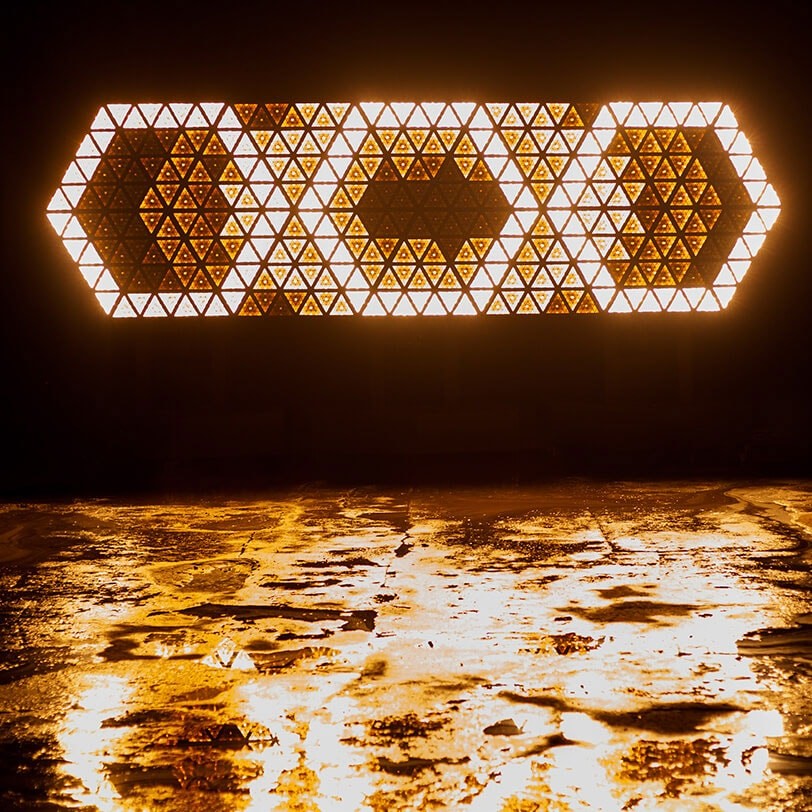 The original R2 pyramid fixture — sixteen individually addressable pixels, tunable white and full RGB, housed in an equilateral form that tiles into diamonds, hexagons, and anything geometry allows. In production since 2018. Design by Giorgos Stylianou-Matsis